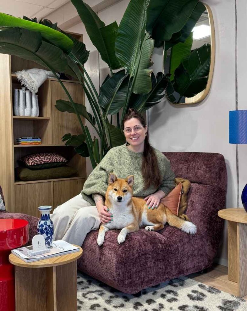 De ruimte heeft een huiselijke sfeer met veel kleur en gezelligheid. Het voelt daardoor niet alleen als een werkplek, maar ook als een inspirerende omgeving waar ideeën tot leven komen. Een hele fijne plek waar hondje Bobbie zich thuis voelt.