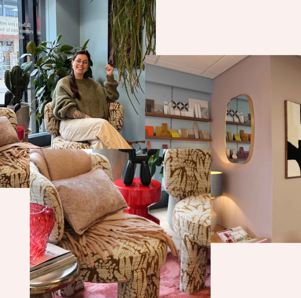 In het atelier liggen alle product-stalen die in de projecten worden meegenomen, waardoor materialen, kleuren, toffe printjes en combinaties direct bekeken en vergeleken kunnen worden. Dit maakt het makkelijker om keuzes te maken die echt passen bij het interieur en de wensen van de klant.